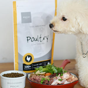 POCHI ザ・ドッグフードは、トッピングすることまで考えられた総合栄養食ドッグフード。ベーシックシリーズとエイジングケアシリーズの2つがあります。どちらも、調理した肉や魚を気軽にトッピングできるよう、低カロリー・低脂肪レシピ、しかも手作りなら選ばないミートミールを使わずに、動物性タンパク源は生肉100%で作りました。さらに健康のこだわりとして、グレインフリー&グルテンフリー。遺伝子組み換え食品も使用していません。