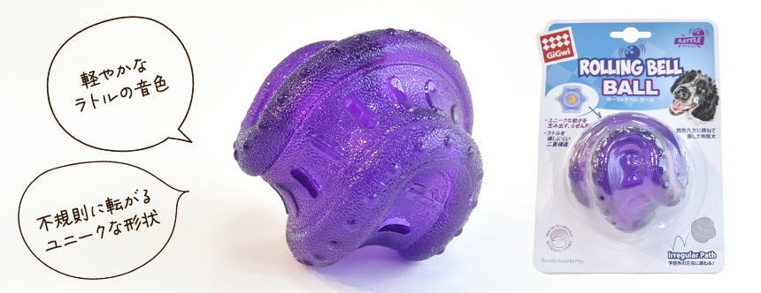 軽快なラトルの音色と不規則に転がるユニークな形状のボールトーイです。