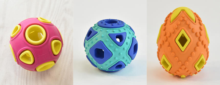 今回、中にオヤツを入れる天然ゴムでできオモチャ3種類とどこに転ぶかわからない予測不能なオモチャが登場です。