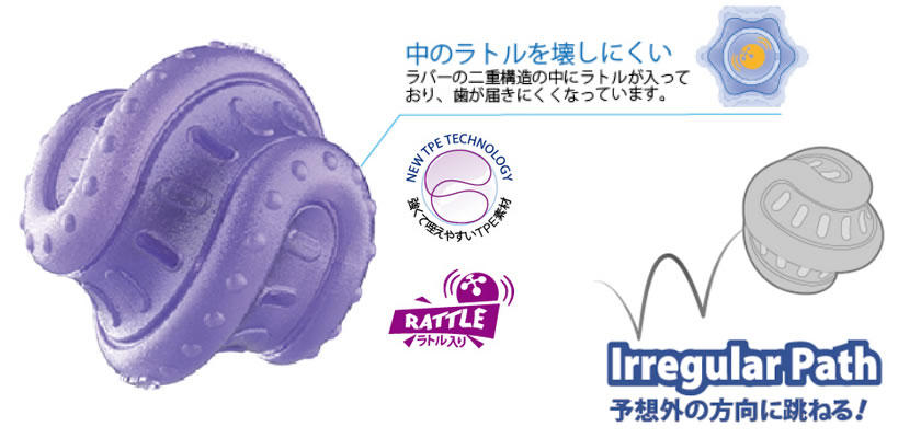・犬の興味をひく軽快な音のラトルがラバーの二重構造の中に入っており、安全に音色を楽しむことができます。