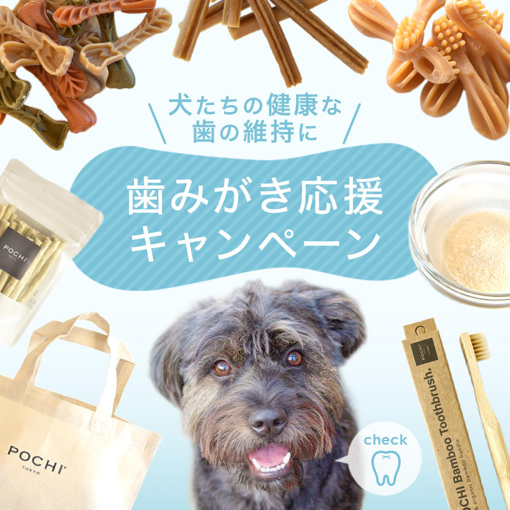 新発売となった「竹歯ブラシ」に、お口にもおなかにもうれしい成分が入ったサプリ「デンタルプロバイオティクス プラス」、おやつ人気ランキングで2年連続1位となった「ナチュラルローハイドガム」のデンタルケアアイテム3つに、POCHIオリジナルのコットントートが付いた、デンタルケアセットが新登場となりました。