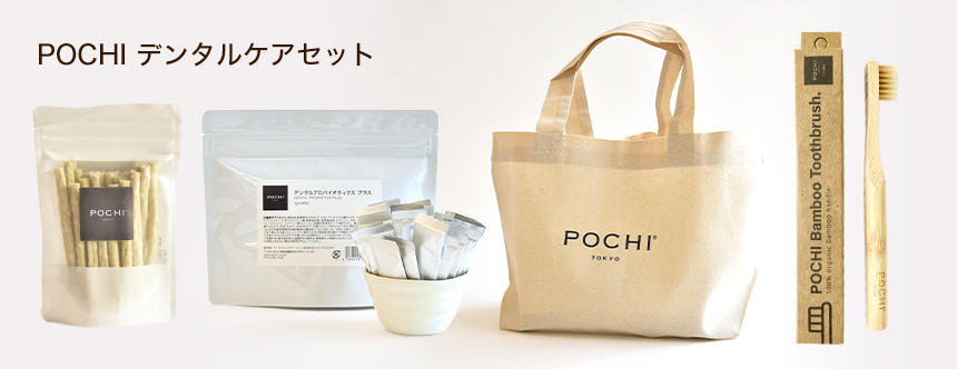 POCHIのオリジナル竹歯ブラシとオリジナルコットントートが付いた、デンタルケアにオススメの特別なセットです。