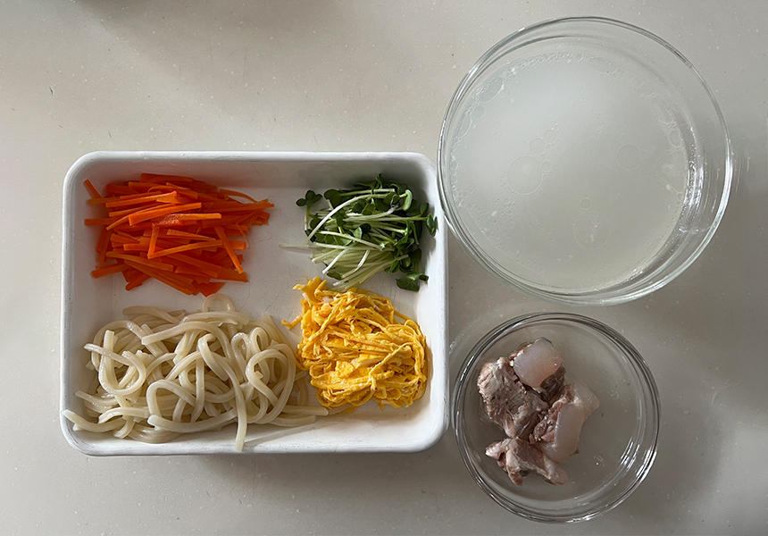 中華麺は、できれば食塩不使用のうどんを使用できると安心です。表示時間より長めに茹でて柔らかくし、食べやすいようカットします。食塩不使用のものが手に入らない場合は、そうめんがおすすめ。グルテンが気になる方は米粉麺にしても◎。