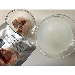 1.POCHI 豚バラ軟骨柔らか煮から具を取り出し、袋についているゼラチン質をお湯で溶かし、混ぜておく。