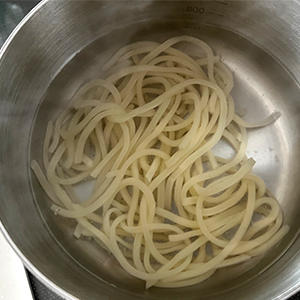 2.鍋でお湯(分量外)を沸かし、うどんを入れ、表記時間よりも2分ほど長く茹で、ザルにあげておく。