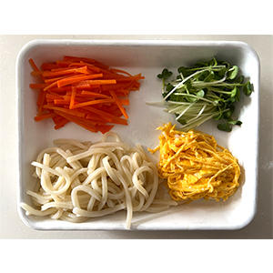 3.人参は千切りにして、柔らかくなるまで茹でる。卵は溶き、フライパンで薄く焼いて千切りにする。(錦糸卵を作っておく)かいわれ大根、2のうどんは食べやすい長さに切っておく。