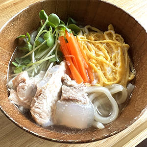 4.器に1のスープ、3のうどんをいれ、1の具、3の残りをトッピングする。