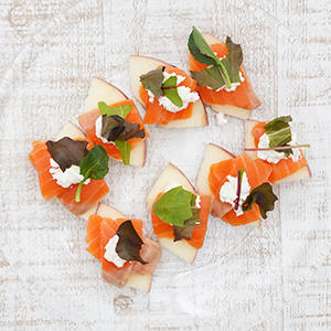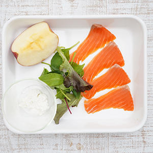 3.器にリンゴ、キングサーモン、カッテージチーズ、ベビーリーフの順でのせれば完成!