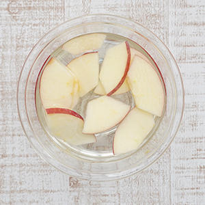 1.リンゴは、5㎜幅のイチョウ切りにして、砂糖水(分量外)につける。キッチンペーパーなどで水気を切る。