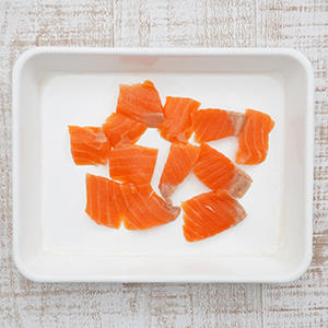 2.サーモンは一口大に切る。飼い主さん用に作る場合は、サーモンをスモークサーモンにすると風味が増します。