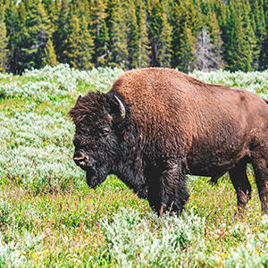 バイソンは現在、アメリカ、カナダ、メキシコと一部のヨーロッパで生息している大きな牛の仲間で、頭と背中が大きく盛り上がった姿が特長です。頭から肩にかけて長い被毛を持っています。