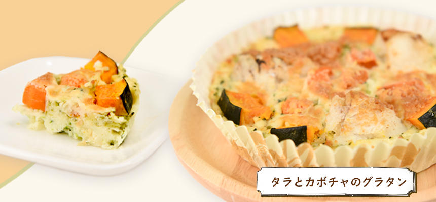 タラと秋野菜のカボチャとニンジンをたっぷり使った秋の味覚を楽しむ特製グラタン。