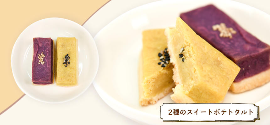 「さつまいも」と「むらさきいも」2種類のスイートポテトをタルト生地と一緒に焼き上げました。