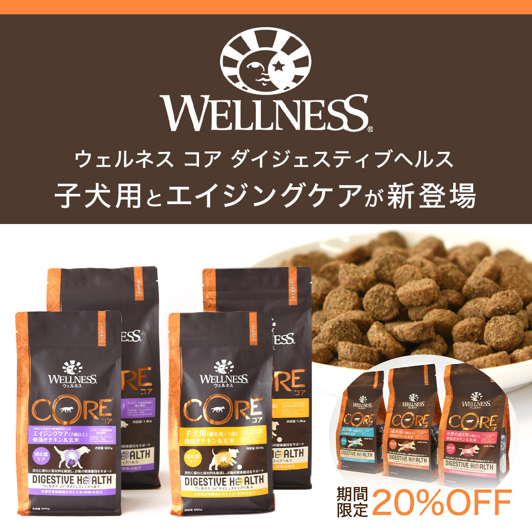 今回、ドライフードの高タンパクシリーズである「ウェルネス コアシリーズ」の、お腹の健康に特化した新シリーズ「ウェルネス コア ダイジェスティブヘルス」に、「子犬用」と「エイジングケア」のライフステージが新登場となりました。