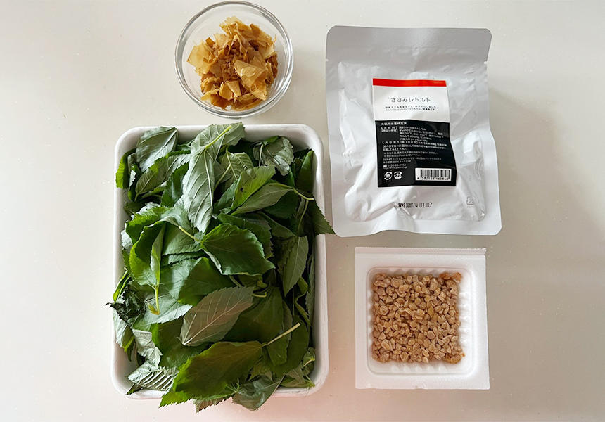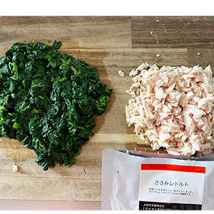 ※ささみレトルトの汁は今回は使いません。捨てずにいつものご飯などにかけて、召し上がってください。