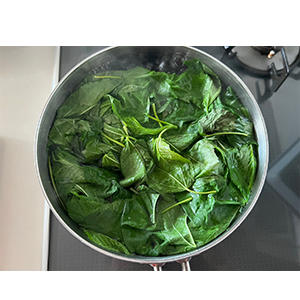 1.鍋でお湯を沸騰させて、モロヘイヤを2分ほど茹でる。茹で上がったら冷水に入れ、しっかりアクをとる。