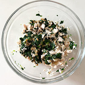 3.ボウルにひきわり納豆、2のモロヘイヤを入れ、よく混ぜてからささみを入れ、軽く混ぜる。