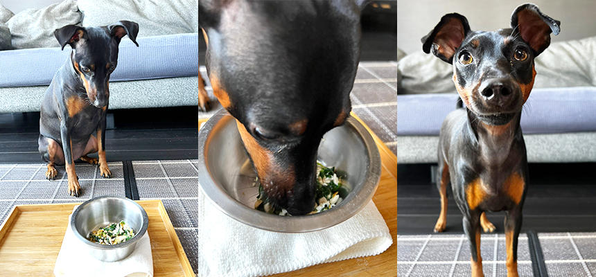 実は納豆もモロヘイヤも初めてですが、ネバネバ食感に夢中の様子。ささみは切るだけなので、筋を取ったり茹でたりと手間が省けてとっても簡単にできました。美味しかったようであっという間に完食。暑い日が続いた夏が過ぎても、食欲が落ちたままの子も多いですし、スルスル食べられるネバネバご飯はピッタリ。次はいつものご飯にかけてアレンジしてみようと思います。