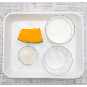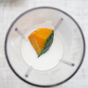 2.ミキサーにゴートミルク・1のかぼちゃ、ふやかしておいた粉寒天を入れて攪拌する。