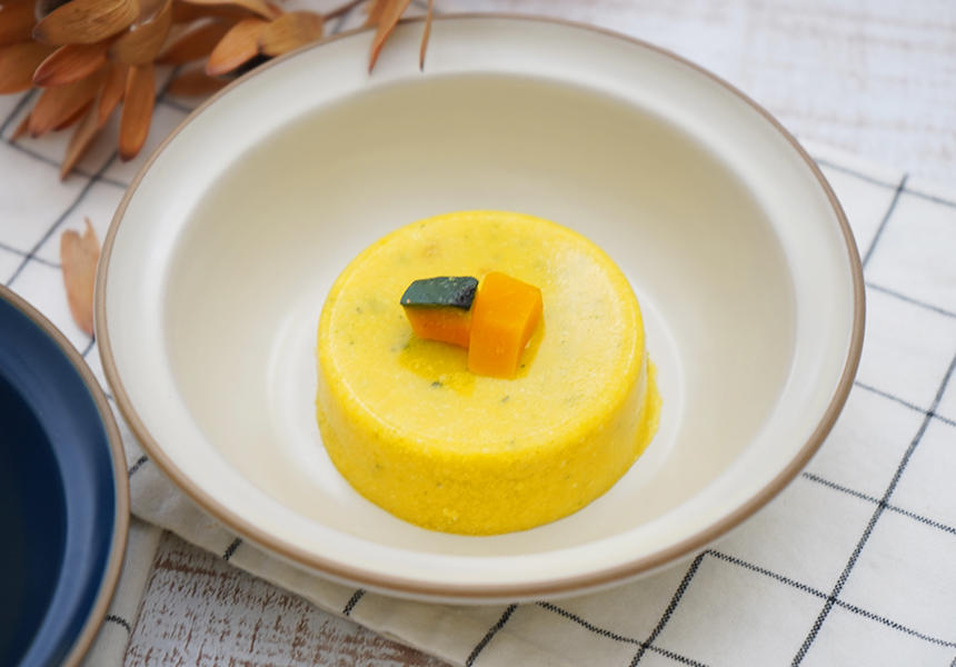 4.型に3を流し入れ、粗熱が取れたら冷蔵庫で固まるまで冷やす。お好みで食べやすいように器に盛り、かぼちゃを飾って完成!