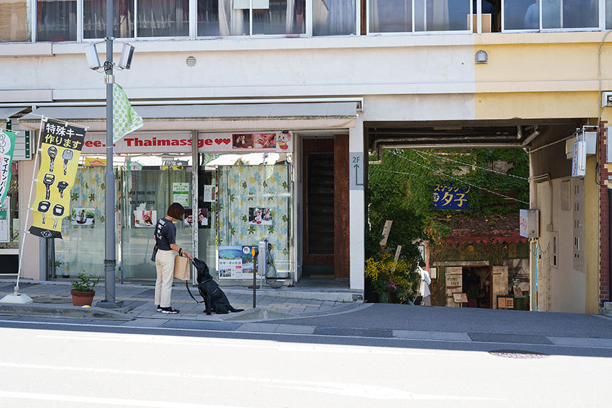 どんな町並みにも、必ず強く惹かれる光景がある。今回それは、駅前通りを歩き始めてすぐ、道を挟んだ先にあった。吹き抜けになっている路地の先に、ツタが絡まった昭和レトロな雑居ビル。『スナック夕子』の看板が、さらに昭和感を盛り上げる。軽く深呼吸をしてカメラを構える。すると、それまで人影がなかった街角に、黒ラブを連れた人たちが現れた。ご夫婦だろうか。タイ式マッサージの看板がある店の前で立ち止まると、男性の方は隣の建物の階段を上がっていった。犬はそれを追いたい気持ちを抑えるように尻尾を立ててぐるぐるとあたりを回る。それをたしなめる形で、一緒に待つ女性がトリーツ(おやつ)を使っておとなしくお座りするよう、促した。
