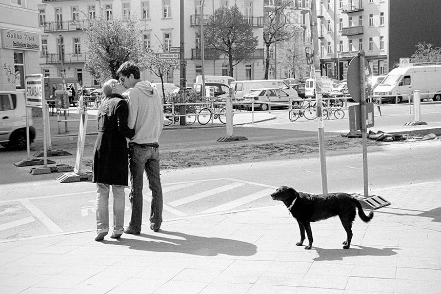そういえば、15年ほど前にストリート・スナップを撮りに通っていたベルリンでも、似たような出来事があった。旧東ベルリンの街角を歩いていた時のこと。やはり道の向こうにタイ物産店があって、古き良きベルリンの雰囲気とのミスマッチを感じてカメラを構えようとしたところ、フラットコーテッド・レトリーバーのような黒い大型犬を連れたカップルが目の前の横断歩道の手前で止まって、さっとキスをした。