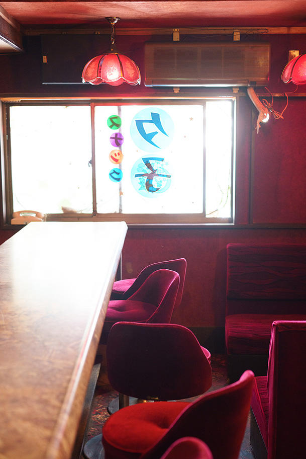 いよいよ「夕子ビル」の前まで歩を進める。1階は今風に改装されて花や雑貨を売る店とカフェとして新装開店したばかりだと分かった。しばし絡まるツタを眺めていると、スタッフの男性が「2階のスナック夕子はそのまま残してあるんですよ。無料開放しているのでぜひご覧ください。良いお写真が撮れると思いますよ」と声をかけてくれた。僕は酒は飲まないし、カラオケもしない昭和生まれの令和っ子だ。でも、付き合いでこの手のスナックに行ったことがないわけではない。入った瞬間、嗅ぎ覚えのある昭和ディープスポット独特の匂いがした。紫色の布貼りの椅子から香る、湿った埃っぽいすえた匂いとでも言うべきか。ここはホンモノだ。