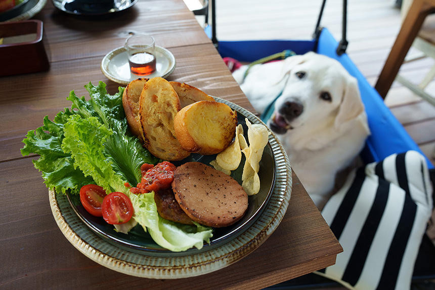 1階の新装開店した『FLORO CAFE』は、裏庭がテラス席になっていて、ありがたいことにペットOKとのこと。フレンチ・トーストのヴィーガンメニューもとてもおいしそうだったので、後日、うちのラブラドール・レトリーバーの「マメスケ」と再訪した。