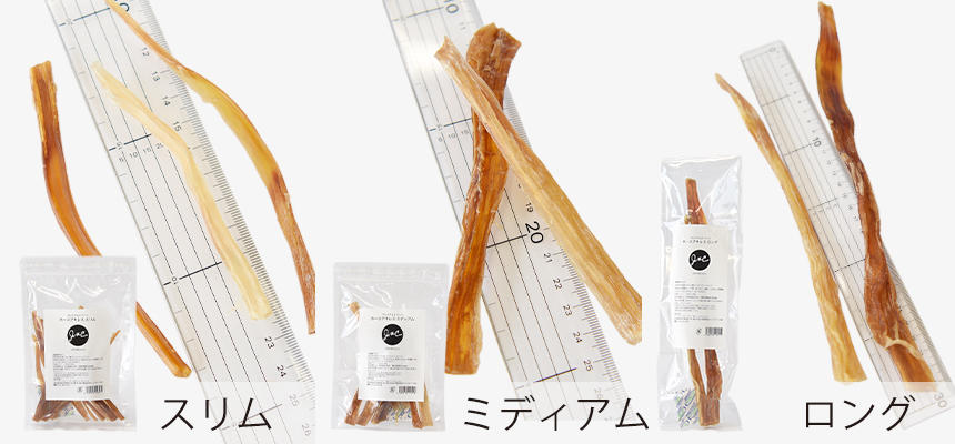 口の小さな小型犬にも食べやすい「スリム」、 しっかりとした噛み応えのある「ミディアム」、 長さが約25~35cmでボリュームのある「ロング」の全3種類をご用意。