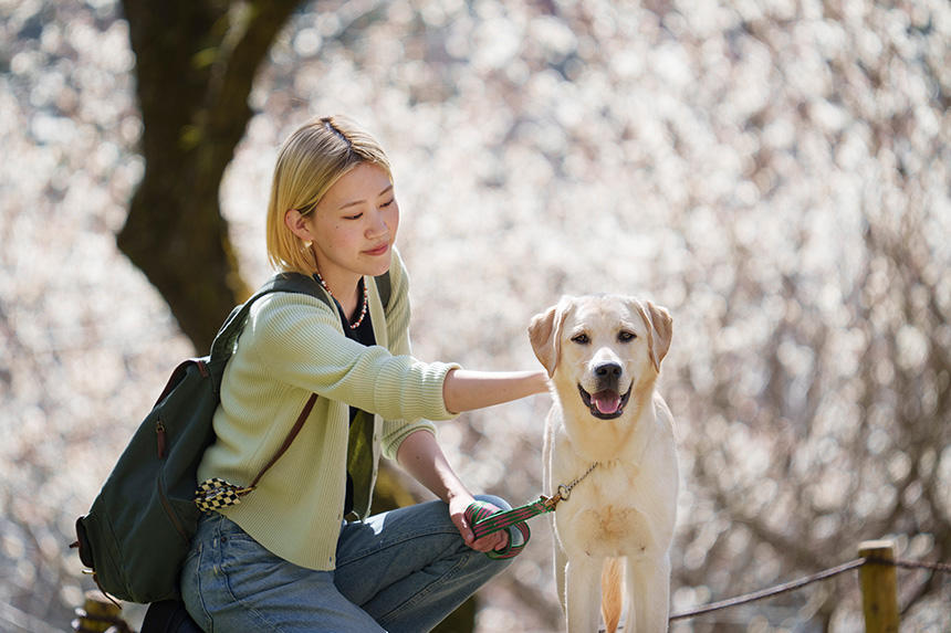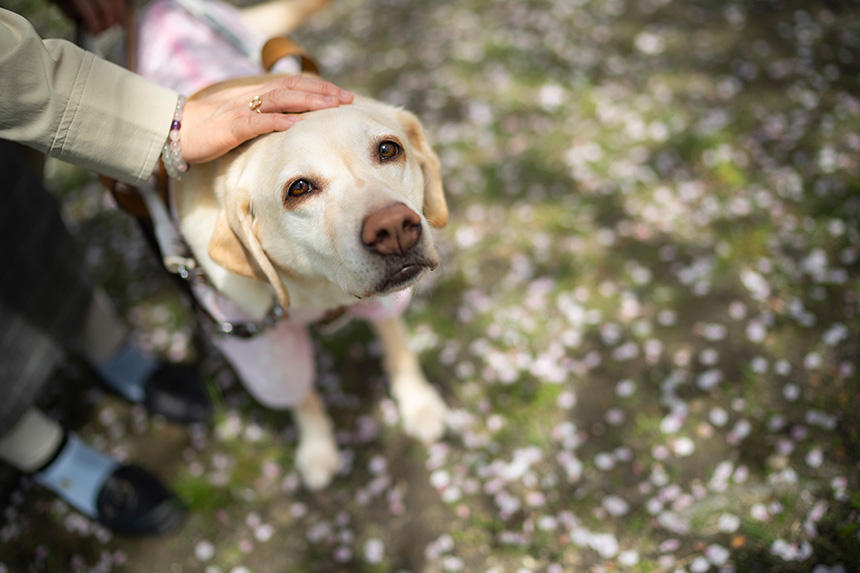僕は、石器時代から人類と共に生きてきた犬の幸せもまた、人の幸せと共にあると考えている。きっと、賢一の言葉の根底にもそれがあるのだと思う。だから、アイメイトの写真を撮影する際には、常に写真の中にしっかり「人の幸せ」が見えてくるように意識している。これまではそれを強調したいがあまり文字通り人の姿を強調した写真も多かったが、先に書いた「犬が小さい!」というお叱りなども考慮した末に、上の2023年4月、下の同11月の写真のように、一見犬が主役な構成でありながら「人の幸せ」が見える形も積極的に取り入れている。