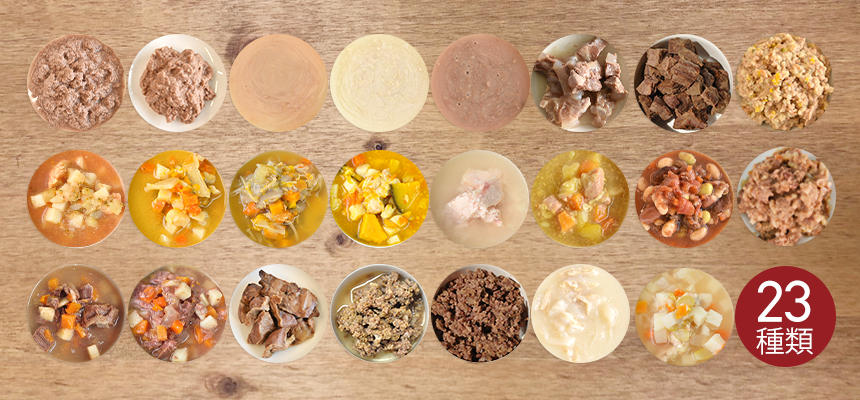 総合栄養食のウェットフード2種をはじめ、がっつりお肉やヘルシーな野菜を使ったスープなどなど、バラエティ豊富な全23種類のレトルトです。クリスマス前にお届け予定ですので、クリスマスディナーとしても活躍します。