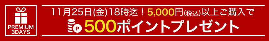 11月25日(金)18時までに 5,000円~10,999円(税込)ご購入いただいた方全員に500ポイントプレゼント!