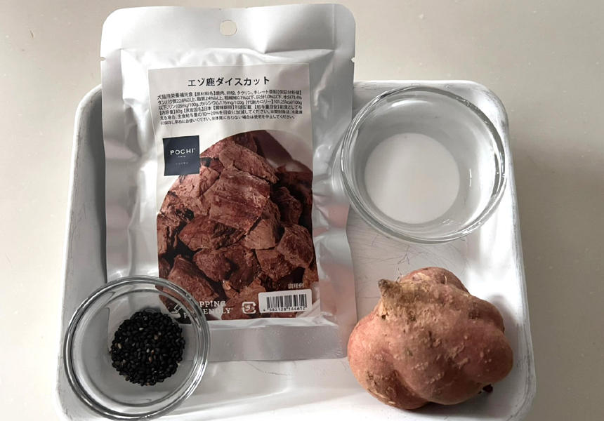 今回はPOCHIエゾ鹿肉 ダイスカットを使った「さつまいもと鹿肉のごま風味」のご紹介です。さつまいもは電子レンジで、大好きな子が多い鹿肉もレトルトを使って作るので、手も汚れず手間が少ない、とてもお手軽にできる時短メニューになっています。