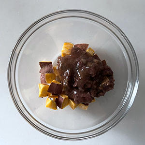 2.別の耐熱ボウルにPOCHI エゾ鹿肉 ダイスカット80gと水溶き片栗粉を加え、よく混ぜ、500w1分加熱する。とろみがつけばOK。