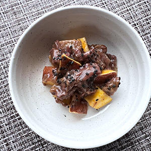 やみつき間違いなし!秋の味覚のごちそう「さつまいもと鹿肉のごま風味」