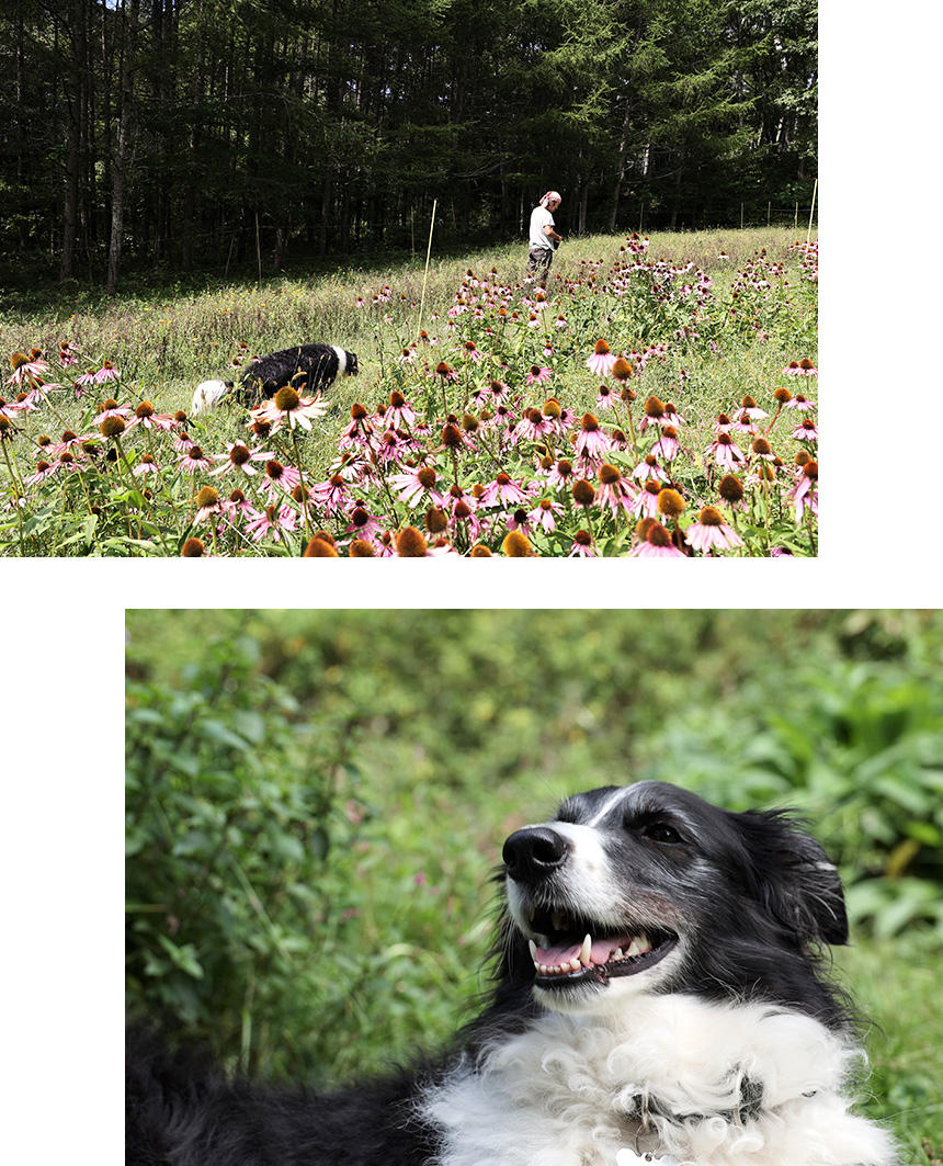 竹脇さんの畑仕事に必ず同行するアイオナちゃんは、畑に接する森まで少しだけ足を延ばして散策したり、草むらの上でゴロゴロ転がったり、竹脇さんや村尾さんのあとについて畑の中を歩いたり、高原の風に吹かれながらまどろんだり……。