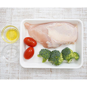 1.鶏むね肉を冷蔵庫から取り出し、塩とオリーブオイルを満遍なく擦り込み、室温で30分寝かせる。