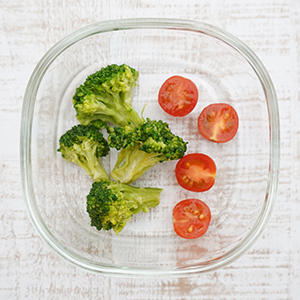 2.ミニトマトは食べやすいよう半分に切る。ブロッコリーは柔らかくなるまで茹で、水気を切る。