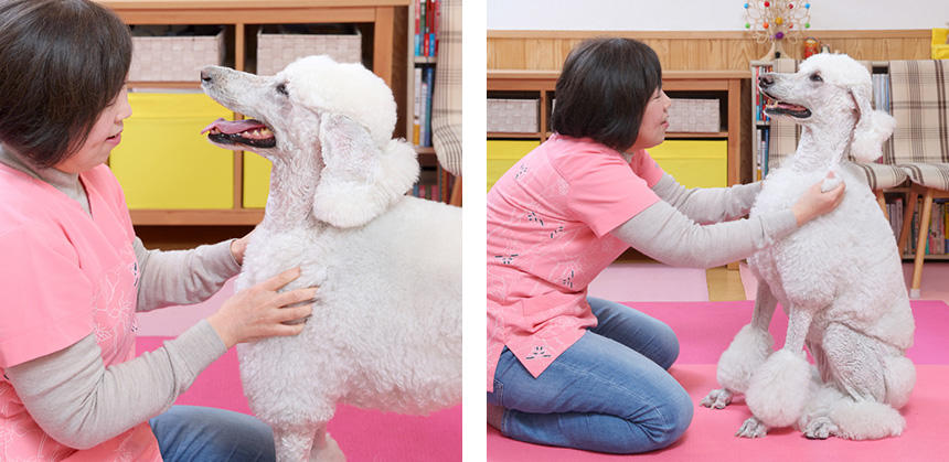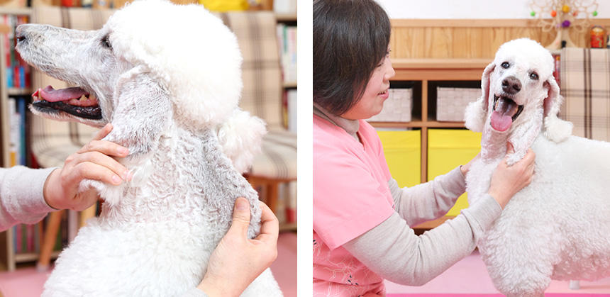 マッサージを始める前に、うちの子の身体の凝り度合いを、まずはチェック。凝ってない犬の場合、皮膚をつまんで引っ張ると、よく伸びます。皮膚がどれくらい伸びるかを、首、肩から背中をとおって腰あたりまで、準備体操をする感覚で確認しましょう。皮膚を引っ張って嫌がらないか、違和感がないかどうか、痛がっていないかどうかもチェックポイントです。
