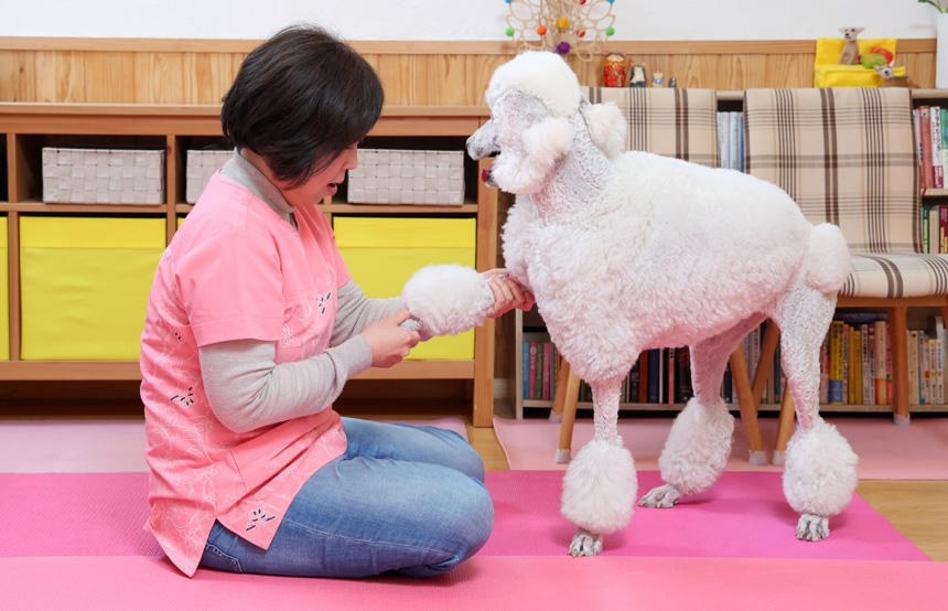 飼い主さんは大きな犬の水かきを手で広げて、指と指の間を自分の指で挟んでぎゅっと圧すようにしてマッサージを。