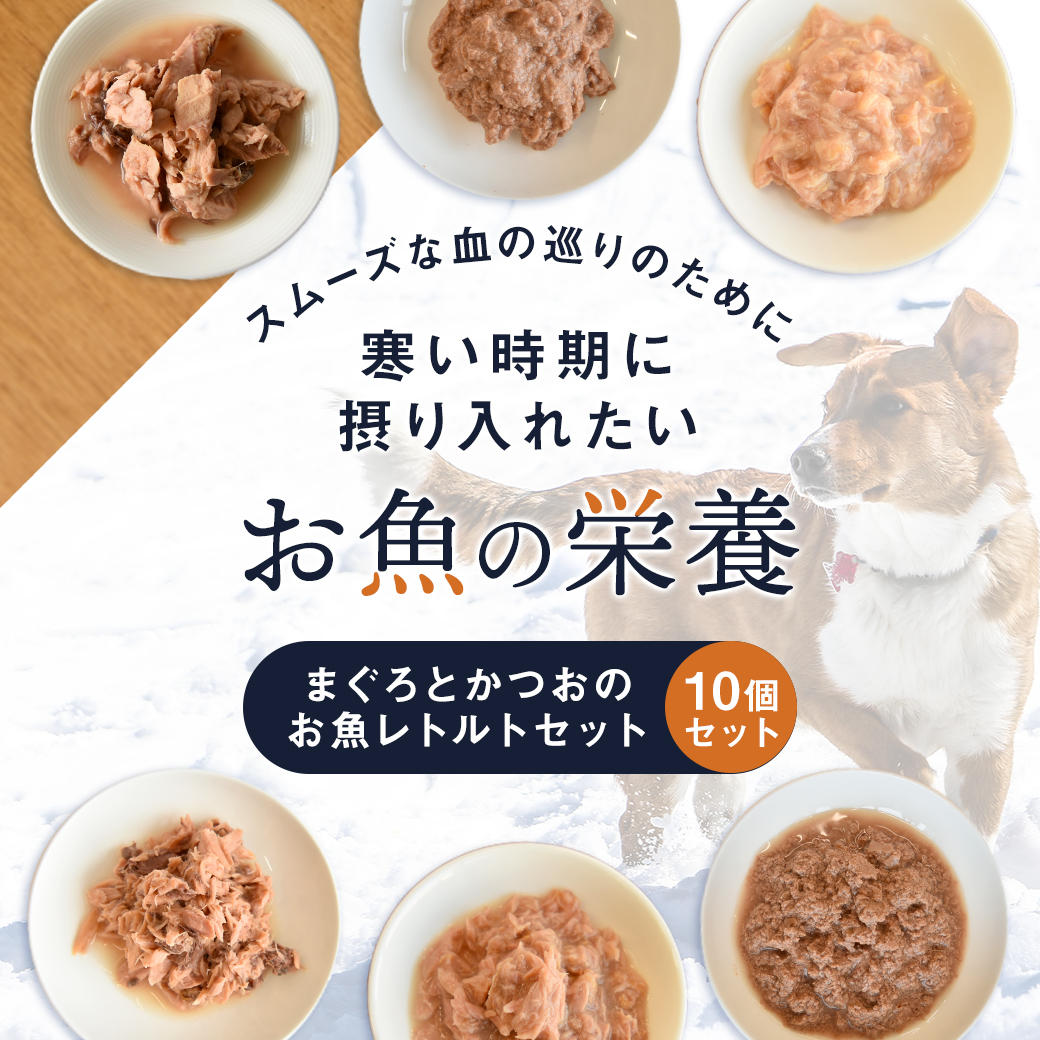 今回季節のお買い得品としてご用意した「まぐろとかつおのお魚レトルトセット」は、 パピーやシニア犬も食べやすい、なめらかな仕上がりの「まぐろのパテ」と「かつおのパテ」の2種類が各3袋と、70グラムと使いきりサイズの「J&C マグロフィレ缶」と「J&C カツオフィレ缶」の2種類が各1個ずつ、そしてグレイン・グルテンフリー、高タンパク・低脂肪、低カロリーなウェットフード「J&C プレミアムパウチ」より、「本かつお」と「キハダまぐろ」を各1個ずつの計10アイテム入り。