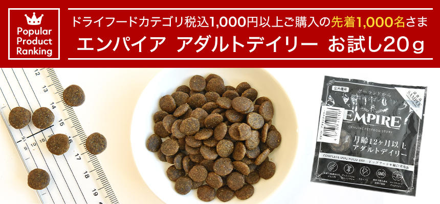 今回、成犬用の「エンパイア DOG アダルトデイリー」のお試しサイズを、 ドライフードカテゴリ税込1,000円以上お買い上げの方先着1,000名さまにプレゼント品としてご用意しました。