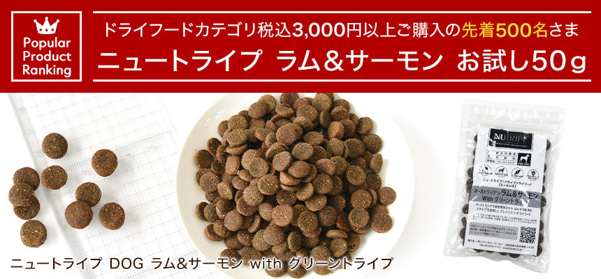 さらにドライフードカテゴリ商品を税込3,000円以上ご購入ならもうひとつのお試し「ニュートライプ DOG ラム&サーモン with グリーントライプ」をプレゼント!