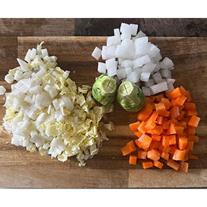 1.人参、大根は皮を剥いて5mm角ほどの大きさに切っておく。白菜も食べやすいよう細かく切っておく。芽キャベツは根元に十字に切り込みをいれ、2分ほど下茹でして水にさらし、半分に切っておく。