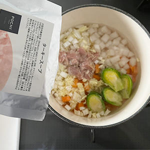 2.鍋にPOCHI ターキースープ、水、1で下ごしらえを済ませた野菜をいれ、野菜が柔らかくなるまで煮込む。(10分目安)