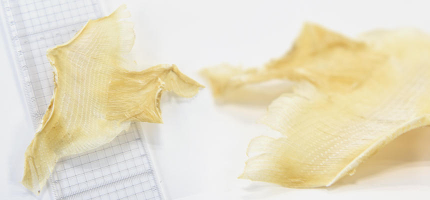 エイヒレを乾燥させた、コラーゲン豊富なおやつ「J&C プレミアムトリーツ エイヒレ姿干し」。