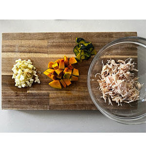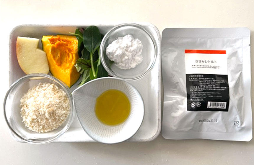 1.かぼちゃはスプーンなどで種を取り除き、皮をむいたら、約2cm角に切る。りんごは皮をむき、約5mm角に切る。POCHIささみレトルトを取り出し、細かくほぐす。