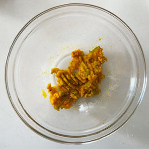 2.1のかぼちゃを耐熱ボウルにいれ、ラップをして500wの電子レンジで3分ほど加熱し、フォークなどでよく潰しておく。