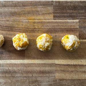 3.ささみをほぐしたボウルに1のりんご、2のかぼちゃ、片栗粉をいれこねるように混ぜ合わせ、4等分にわけたら一口サイズにぎゅっと丸める。