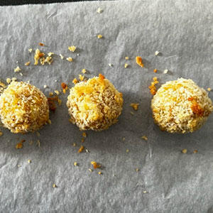 4.パン粉とオリーブオイルを合わせて混ぜたものを3の表面に満遍なくぎゅっとつける。